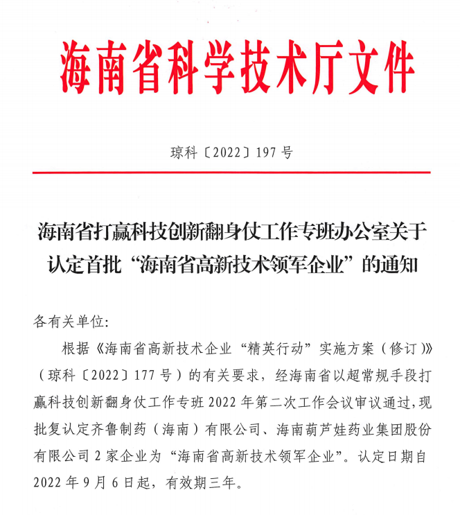 近日,海南省科学技术厅发布的《海南省打赢科技创新翻身仗工作专班办公室关于认定首批“海南省高新技术领军企业”的通知》中显示,批复认定海南Z6尊龙凯时药业集团股份有限公司等2家企业为“海南省高新技术领军企业”。认定日期自2022年9月6日起,有效期三年。
